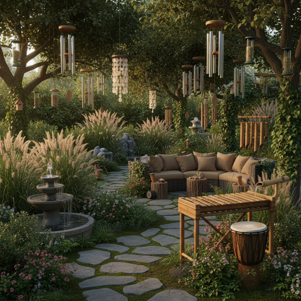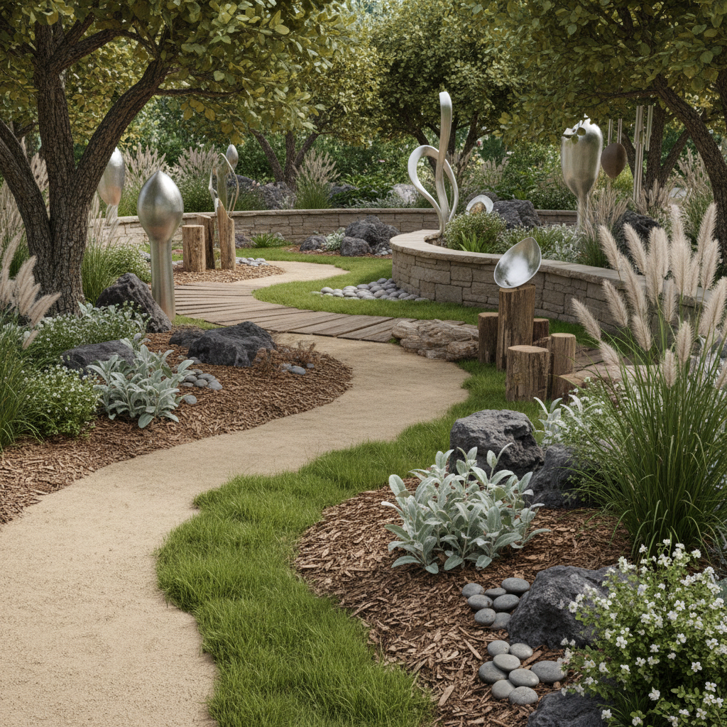 •Strefa słuchu – dzwonki wietrzne, rury dźwiękowe, ksylofon ogrodowy, nasadzenia roślin „szumiących” na wietrze (trawy ozdobne, bambus mrozoodporny), budki lęgowe i roślinność przyciągająca ptaki, by natura generowała naturalne dźwięki;